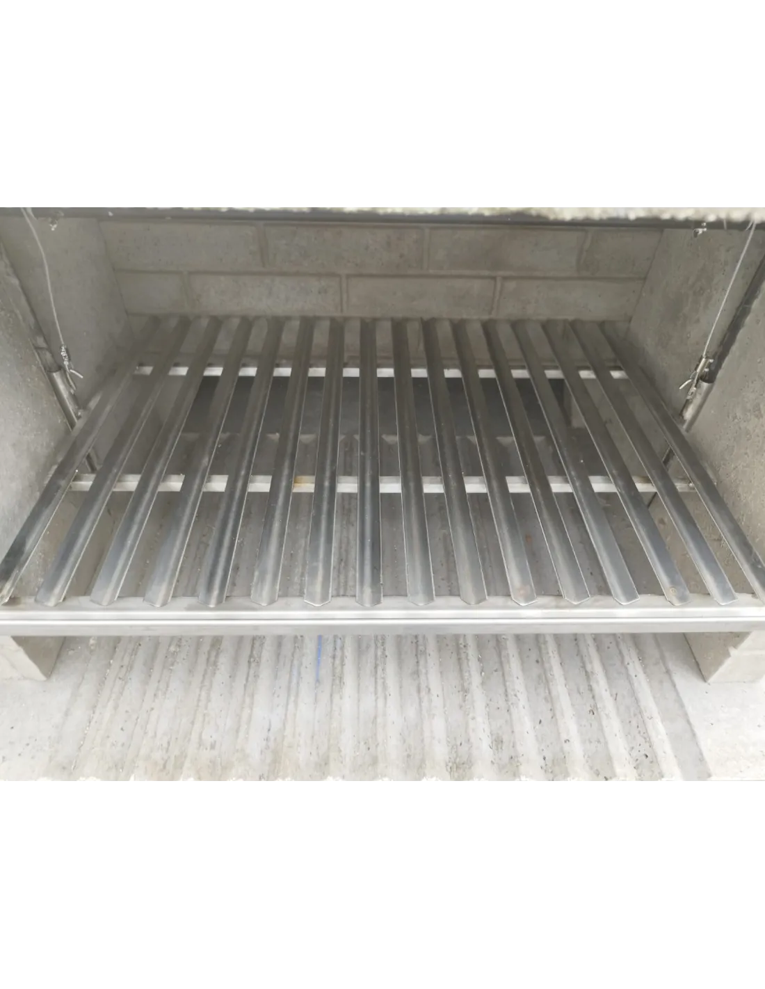 - Grille entièrement en acier inoxydable avec support et manivelle latérale également en acier inoxydable.