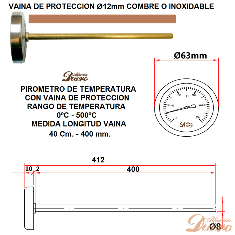 - Pyromètre avec gaine, échelle 0-500 °C.